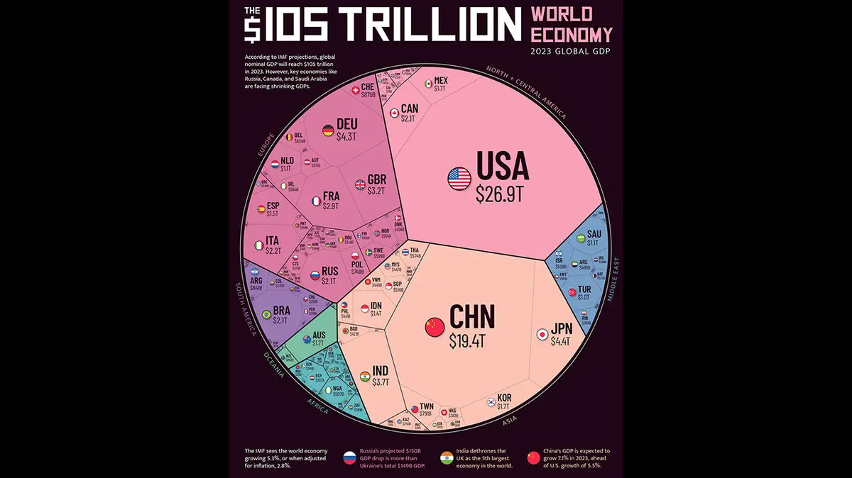 بنا بر گزارش صندوق بین المللی پول، ایالات متحده بیش از 25 درصد از درآمد و تولید ناخالص داخلی جهان در سال 2023 را به خود اختصاص می دهد. سهم چین از کیک اقتصاد جهان، حدود 18درصد است و ژاپنی ها و آلمانی هر کدام حدود 4 درصد از اقتصاد 105 تریلیون دلاری جهان را به خود اختصاص داده اند.
