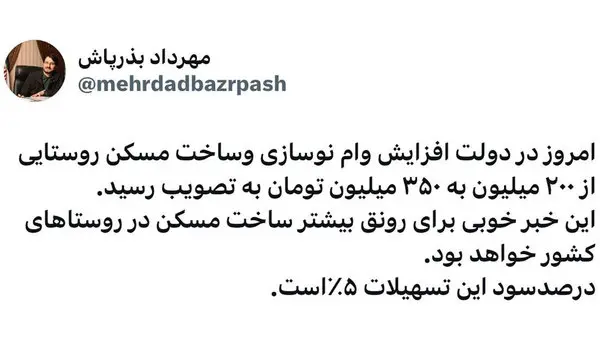 مهرداد بذرپاش وزیر راه و شهرسازی روزهای اخیر در صفحه شخصی خود نوشت: امروز چهارشنبه سوم آبان ۱۴۰۲ در دولت افزایش وام نوسازی و ساخت مسکن روستایی از ۲۰۰ میلیون تومان به ۳۵۰ میلیون تومان به تصویب رسید. این خبر خوبی برای رونق بیشتر ساخت مسکن در روستاهای کشور خواهد بود.
