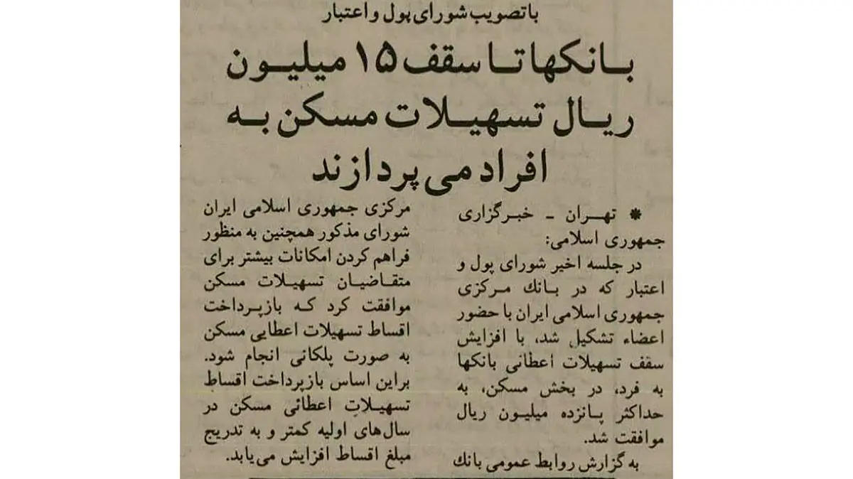 به گزارش رکنا، روزنامه اطلاعات 17 آبان 1372 نوشـت: با تصویب شورای پول و اعتبار، بانک ها تا سقف 15 میلیون ریال تسهیلات مسکن به افراد می پردازند.