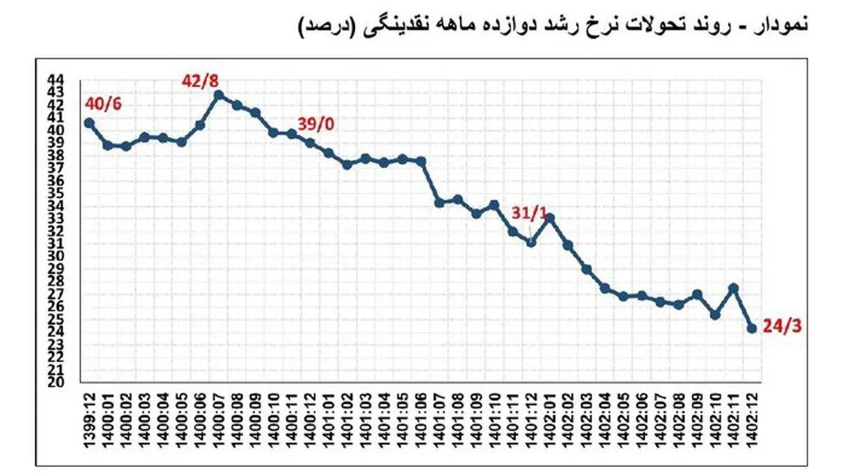 مرور مسیر طی شده نشان دهنده آن است که نرخ رشد دوازدهماهه نقدینگی از ۴۲.۸ درصد در پایان مهرماه ۱۴۰۰ طی یک روند نزولی به۳۱.۱ درصد در پایان سال ۱۴۰۱ و متعاقبا به ۲۴.۳ درصد در پایان سال ۱۴۰۲ رسیده است.