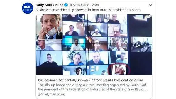 گزارش رسانه های خارجی حاکی از آن است که مرد برزیلی هنگام ویدیو کنفرانس با رئیس جمهور این کشور دوربین چت زوم خود را خاموش نکرد و مشغول حمام کردن شد که خوشبختانه ارتباط دهنده ویدیو کنفرانس، وی را از چت بیرون انداخت اما رئیس جمهور این صحنه دور از شان و ادب دید.