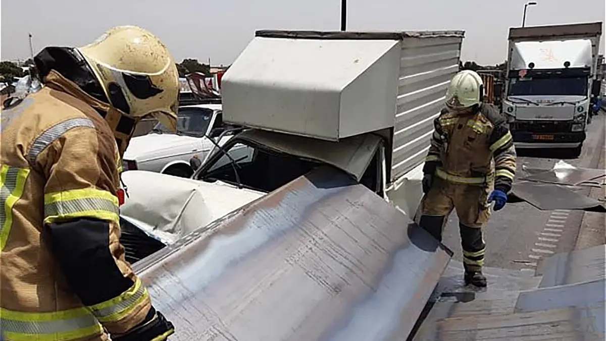 به گزارش رکنا، محسن نجفی فرمانده نیروهای آتش نشانی در این باره گفت: چند دستگاه خودرو باری سبک و سنگین شامل؛ وانت نیسان، وانت پیکان و کامیونت ایسوزو حین حرکت در مسیر به علت نامعلومی با یکدیگر برخورد کرده بودند که براثر این حادثه، ورق های فلزی در قسمت بار خودرو وانت نیسان بر روی خودرو وانت پیکان سقوط کرده بود.
