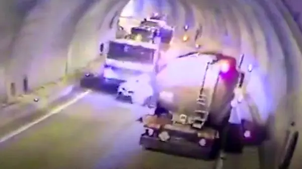 به گزارش رکنا، سبقت غیرمجاز یک خودروی سواری در تونل باعث حادثه دلخراش شد.راننده سواری که قصد سبقت از یک جرثقیل در تونل را داشت ناگهان با تریلی دیگری مواجه شد و بین آن دو گیر افتاد.