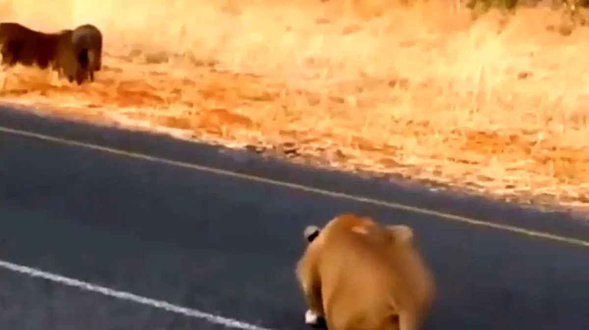 در فیلم زیر، حمله زیرکانه شیر ماده به یک گراز را مشاهده میکنید.