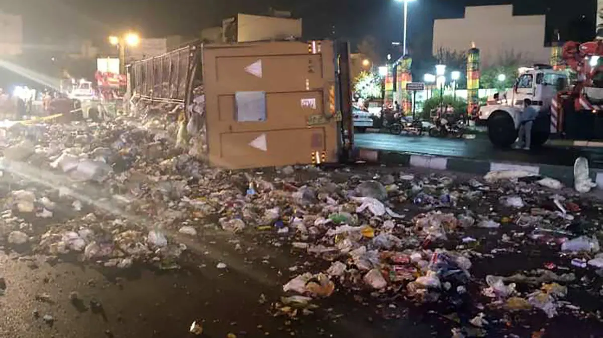 حوادث رکنا: کامیون محموله زباله در وسط خیابان واژگون شد.