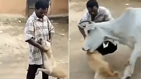 حمله گاو هندی به مرد سگ آزار + بهترین فیلم