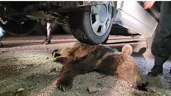 عکس تلخ / له شدن خرس قهوه ای زیر چرخ های پژو