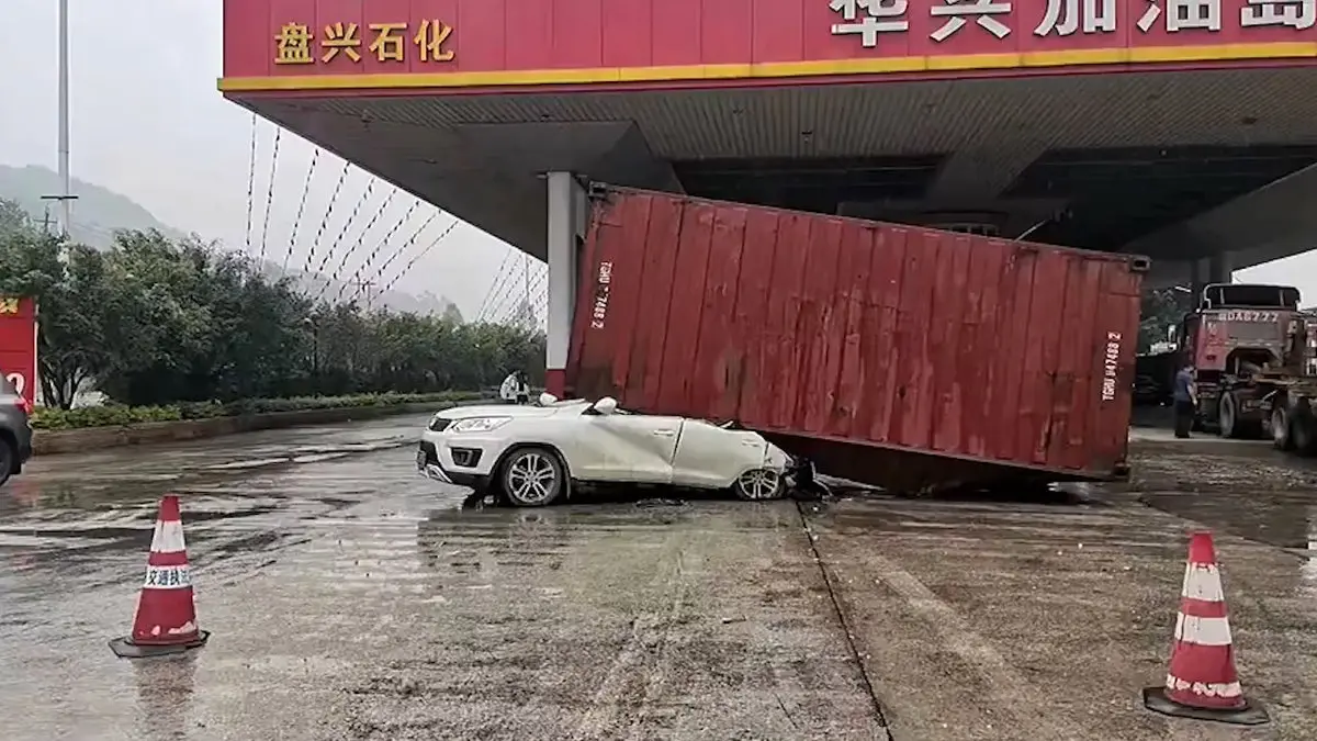 رکنا : کانتینر حمل و نقل از کامیون می افتد و روی ماشین فرود می آید.