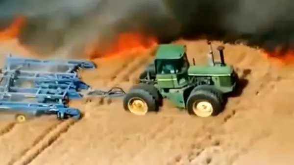 به گزارش رکنا، حجم آتش سوزی به قدری بود که کاری از آتش نشانان ساخته نبود. ده ها هکتار زمین گندم در معرض آتش سوزی بودند. صاحب زمین عاجزانه نابودی زمینش را می دید. هلی کوپتر خبری اما ناگهان متوجه چیزی شد. دوستش تنهایی به کمکش رفت. دمای منطقه آتش نزدیک به 700 درجه بود و حجم اکسیژن نصف. تراکتور سرعت زیادی ندارد. او در حال ایجاد حائل بین آتش و باقی زمین است. هر لحظه امکان بیهوشی و انتقال آتش وجود دارد اما در پایان موفق شد.