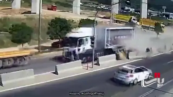 فیلم باورنکردنی از لحظه پرش شدن یک خودرو توسط تریلی / معجزه در خودروی مچاله شده