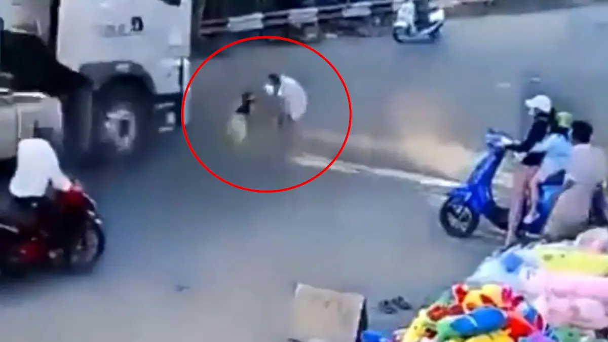 رکنا: پسر بچه در حال عبور از خیابان بود که مرد جوان با دیدن این صحنه و قبل از اینکه او زیر چرخ های تریلی برود به کمکش رفت.