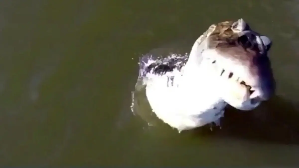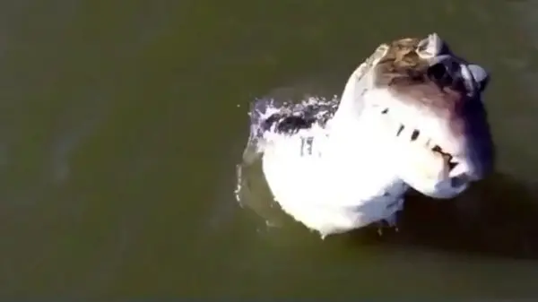 ویدئوی شگفتانگیز تمساح را نشان میدهد که سر خود را کمی روی آب آورده و چشمانش را به پهپاد دوخته است. چند ثانیه بعد تمساح، با جهشی خیره کننده پهپاد را ربود.