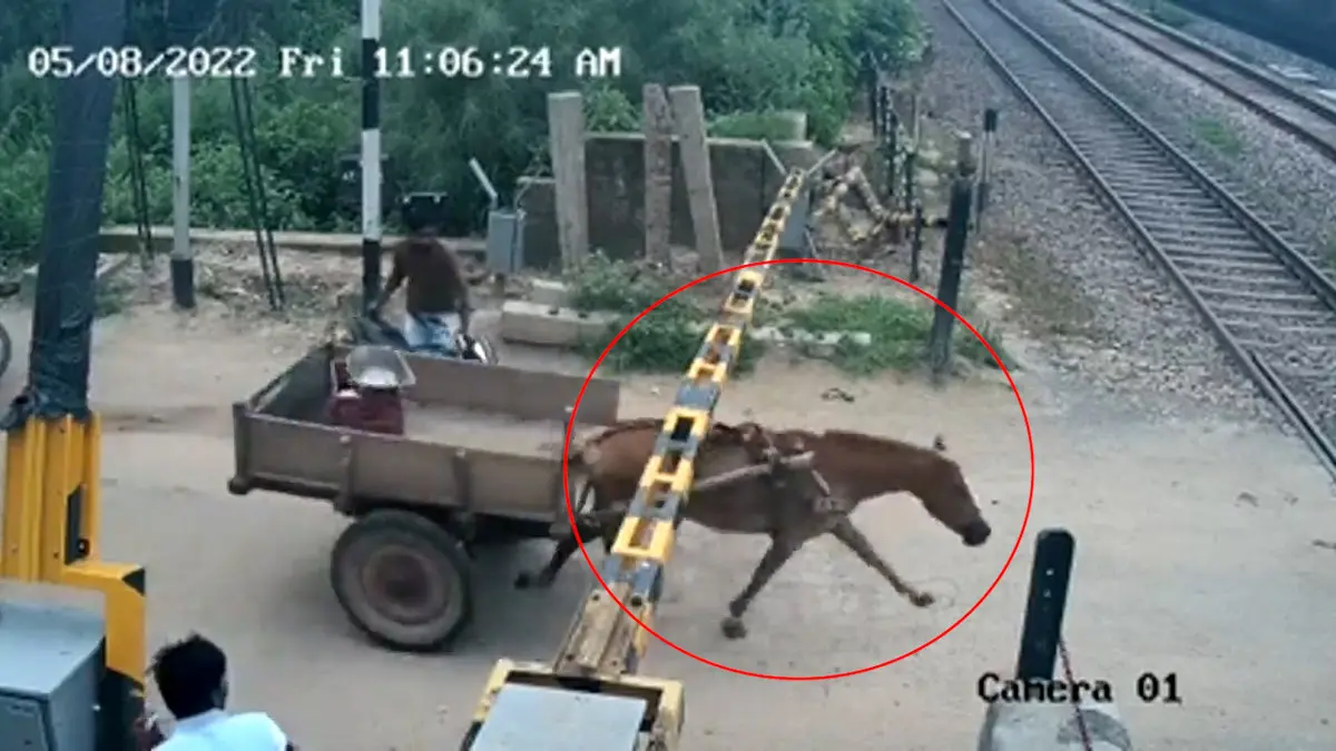 دوربین مدار بسته تصاویر خری را نشان می دهد که از دست صاحب خود فرار کرده و با به جان خریدن خطر روی ریل راه آهن می دود.