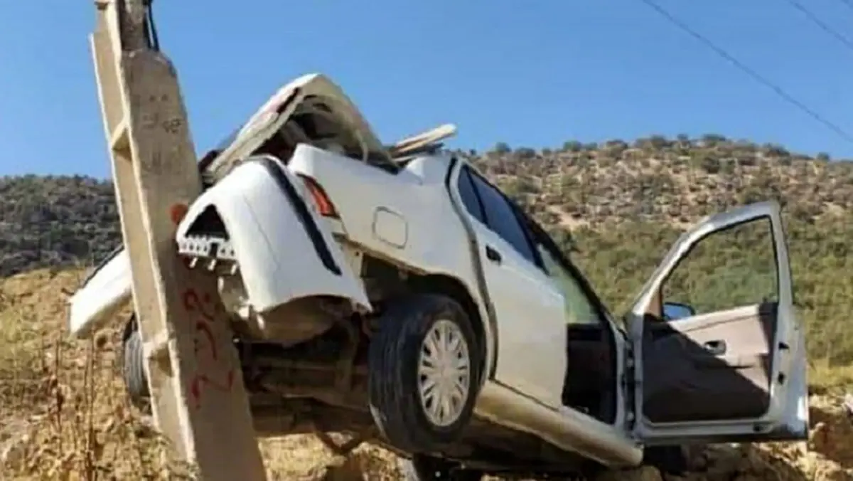 تصادف هولناک سمند با تیرچراغ برق در توس / سمند مچاله شد