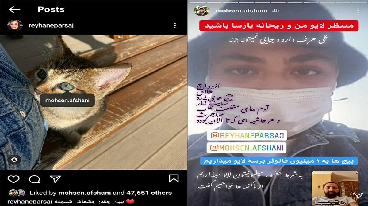 محسن افشانی پس از پست ریحانه پارسا چند استوری منتشر کرد که نشان می دهد ریحانه پارسا و محسن افشانی وارد رابطه کاری شده اند همچنین محسن افشانی از مردم و طرفداران خود درخواست کرد که به شایعات توجهی نکنند تا آینده ریحانه پارسا به تباهی کشیده نشود.