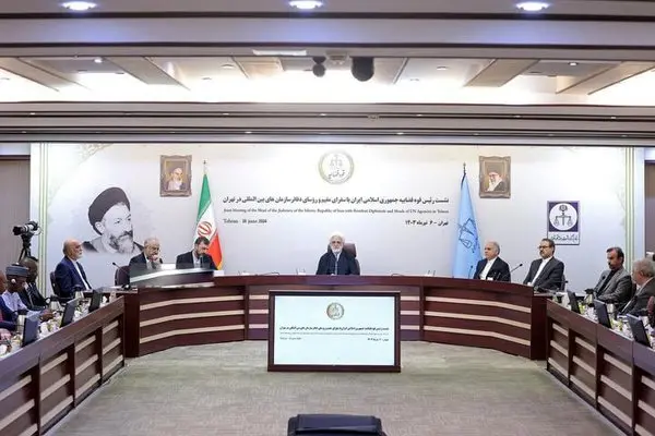 رئیس قوه قضاییه در ادامه با اشاره به آمادگی جمهوری اسلامی ایران برای انعقاد پیمانهای حقوقی و قضایی با سایر کشورها، اظهار کرد: ما بر انعقاد تفاهمات و توافقات به منظور گسترش معاضدتهای حقوقی و قضایی با سایر کشورها تاکید داریم. ما معتقدیم توسعه روابط و مراودات کشورها در حوزههای سیاسی و اقتصادی و فرهنگی زمانی به نتیجه غایی و موثر ختم میشود که تفاهمات و توافقات حقوقی و قضایی نیز میان آنها بسط و گسترش یابد. امروز نیاز است با عنایت به تحولات و تطورات در حوزههای ارتباطی و فناورانه، مراودات حقوقی و قضایی میان کشورها مبتنی بر قواعد دنیای جدید ارتقاء یابد.