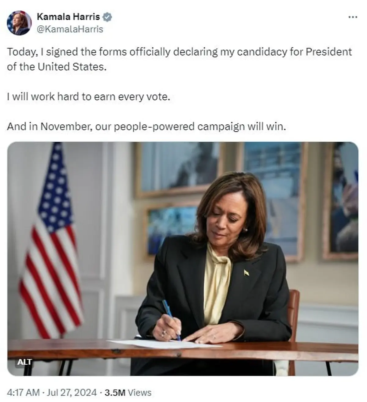 در پیام هریس آمده است: امروز، من فرمهایی را امضا کردم که به طور رسمی نامزدی خود را برای ریاست جمهوری آمریکا اعلام میکنم. برای کسب هر رأی سخت تلاش خواهم کرد و در ماه نوامبر، کارزار مردمی ما پیروز خواهد شد.