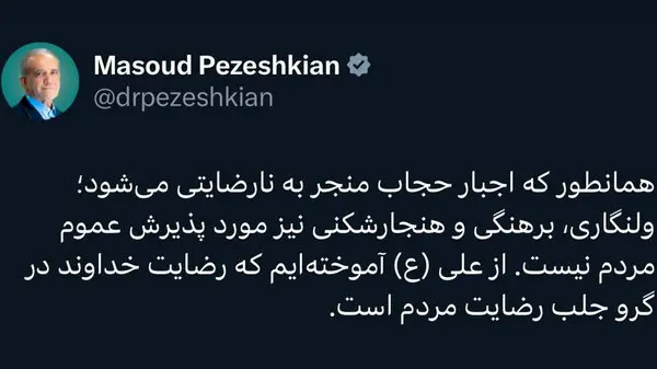 همانطور که اجبار حجاب منجر به نارضایتی میشود؛ ولنگاری، برهنگی و هنجارشکنی نیز مورد پذیرش عموم مردم نیست. از علی (ع) آموختهایم که رضایت خداوند در گرو جلب رضایت مردم است.»