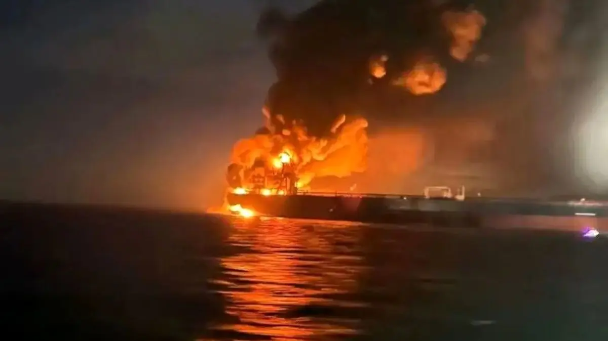 تصویری که در ۲۸ نوامبر منتشر شده، شعلهها و دود غلیظ را نشان میدهد که پس از انفجارهایی که دو کشتی از ناوگان سایه روسیه در دریای سیاه را هدف قرار داد، از یک نفتکش برخاسته است.