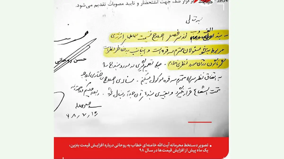 دستخط محرمانه حضرت آیتالله خامنهای خطاب به روحانی یک ماه پیش از افزایش قیمتها در سال ۹۸ برای نخستین بار منتشر شد.