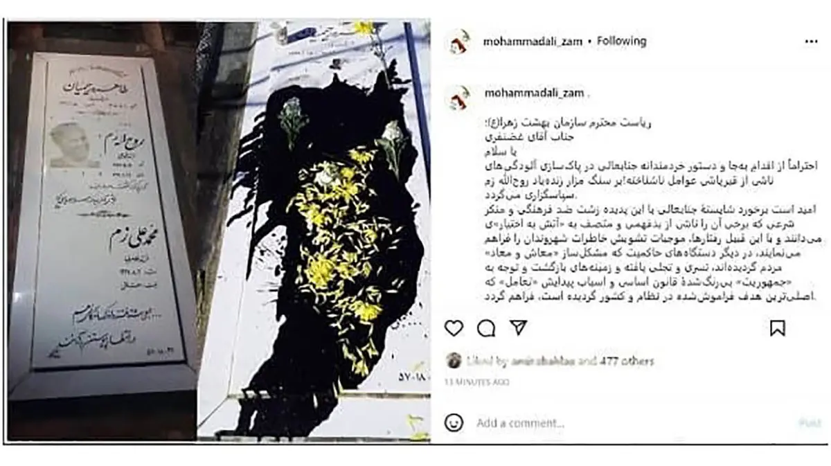 به گزارش رکنا، محمدعلی زم، پدر روح الله زم در اینستاگرام نوشت: ریاست محترم سازمان بهشت زهرا (ع)