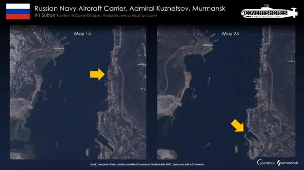 به گزارش رکنا، با مقایسه تصاویر ماهواره ای گرفته شده از بندر مورمانسک روسیه در فاصله 15می تا 24می(دیروز) ، تنها ناوهواپیمابر این کشور ادمیرال کوزنتسوف که در بندر پهلو گرفته بود به حوضچه خشک جهت ادامه تعمیرات و اورهال منتقل شده است./ کانال پارتیزان