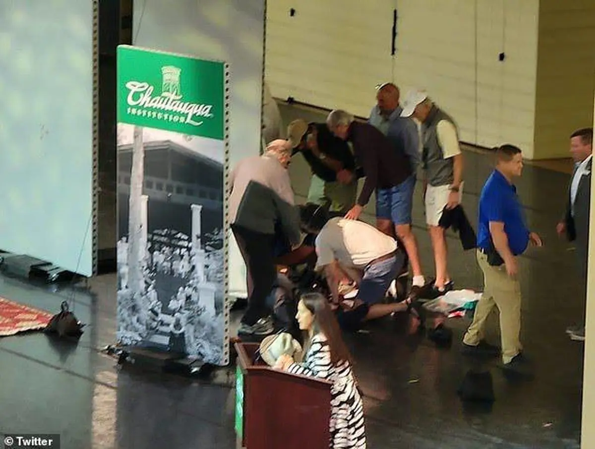 شاهدان عینی گفتند که یک مرد با پریدن به روی محل سخنرانی، سلمان رشدی را با ضربات مشت و چاقو مورد حمله قرار داد.