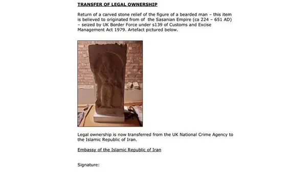 مجسمه سرباز ساسانی که قاچاقی وارد انگلیس شده بود پس از اثبات مالکیت که متعلق به ایران است، و بعد از آنکه سه ماه در موزه بریتانیا به امانت نمایش گذاشته شد، تحویل ایران شد.