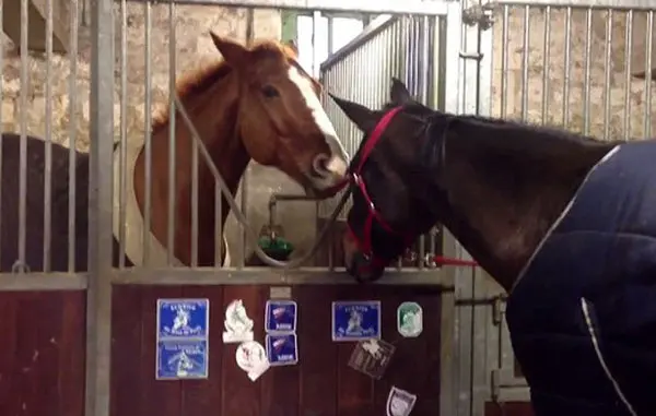 اسب دیگر نیز به کمک او رفته و مشغول جداکردن افسار او با دهانش می شود. پس از حدود یک دقیقه تلاش این اسب موفق به جداکردن این افسار می شود.