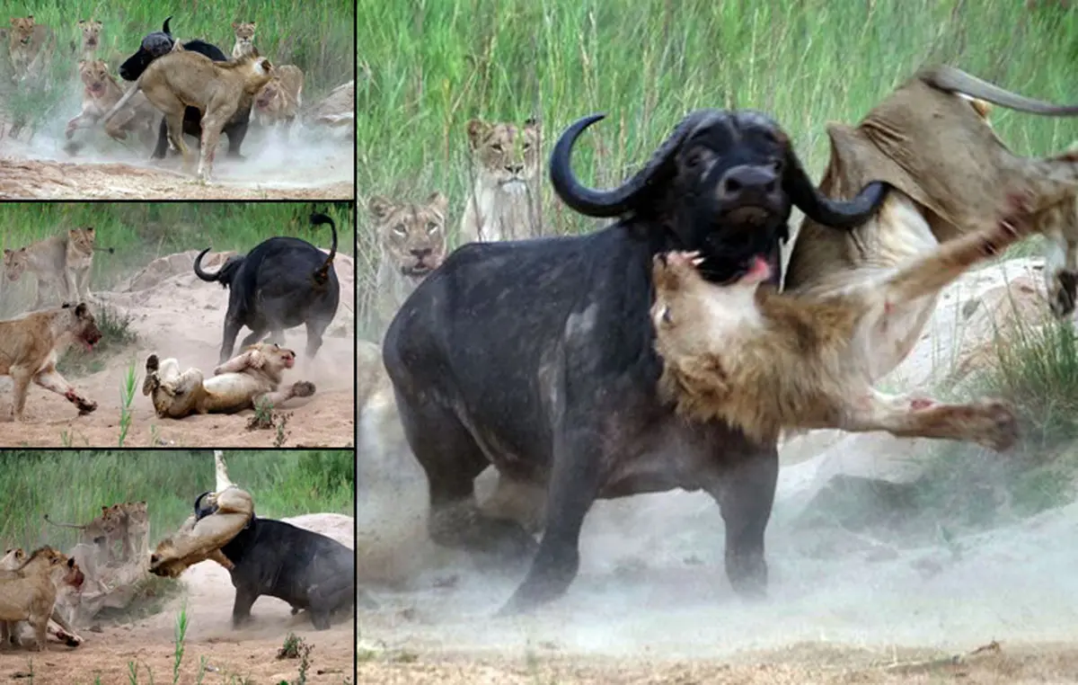 در همین زمان ابتدا شیرهای نر وحشتزده از بوفالو فاصله گرفتند اما دستبردار نبودند و هر شیر سعی داشت به بوفالو حمله کند اما بوفالوی خشمگین با قدرت هرچه تمامتر در مقابل مهاجمان درنده مقاومت میکرد و توانست چندینبار شیر را به هوا پرتاب و گروه درندگان را تار و مار کند.