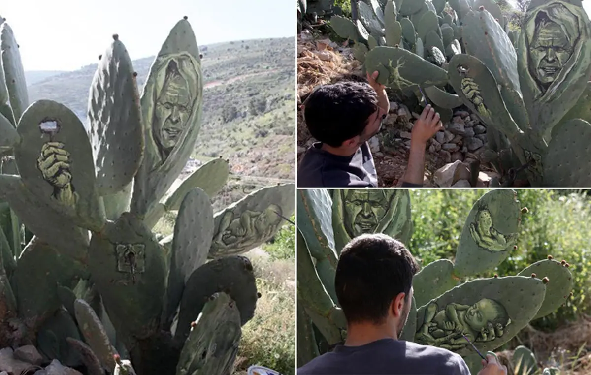 رکنا: هنرمند و نقاش فلسطینی احمد یاسین در روستای اسیرا تصاویر زیبایی را روی برگ کاکتوسها نقاشی میکند.