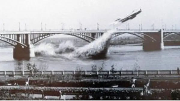 این تصویر مربوط به عبور میگ متعلق به شوروی سابق در ۱۴ جون سال ۱۹۶۵ میلادی از زیر پُل توسط خلبان Valentin Privalov است.