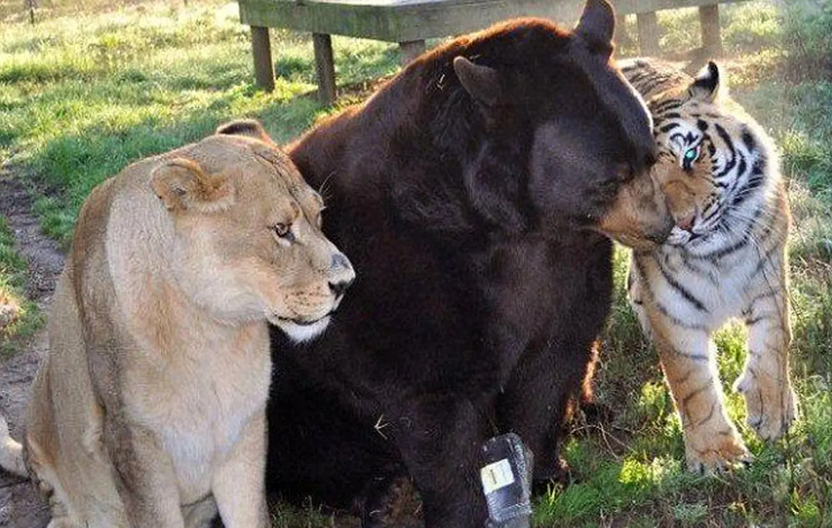 این سه حیوان حدود 15 سال است که در منطقه جورجیای امریکا در خانهای کوچک زندگی میکنند و هر سه رابطه کاملاً دوستانهای در پناهگاه حیاتوحش جورجیا دارند و نگهبانان پناهگاه برای هر کدام اسمی انتخاب کردهاند. «بالو» نام خرس، «لئو» نام شیر و «خان» اسم ببری است که زندگی کاملاً متفاوتی نسبت به همنوعان دیگر خود دارند.