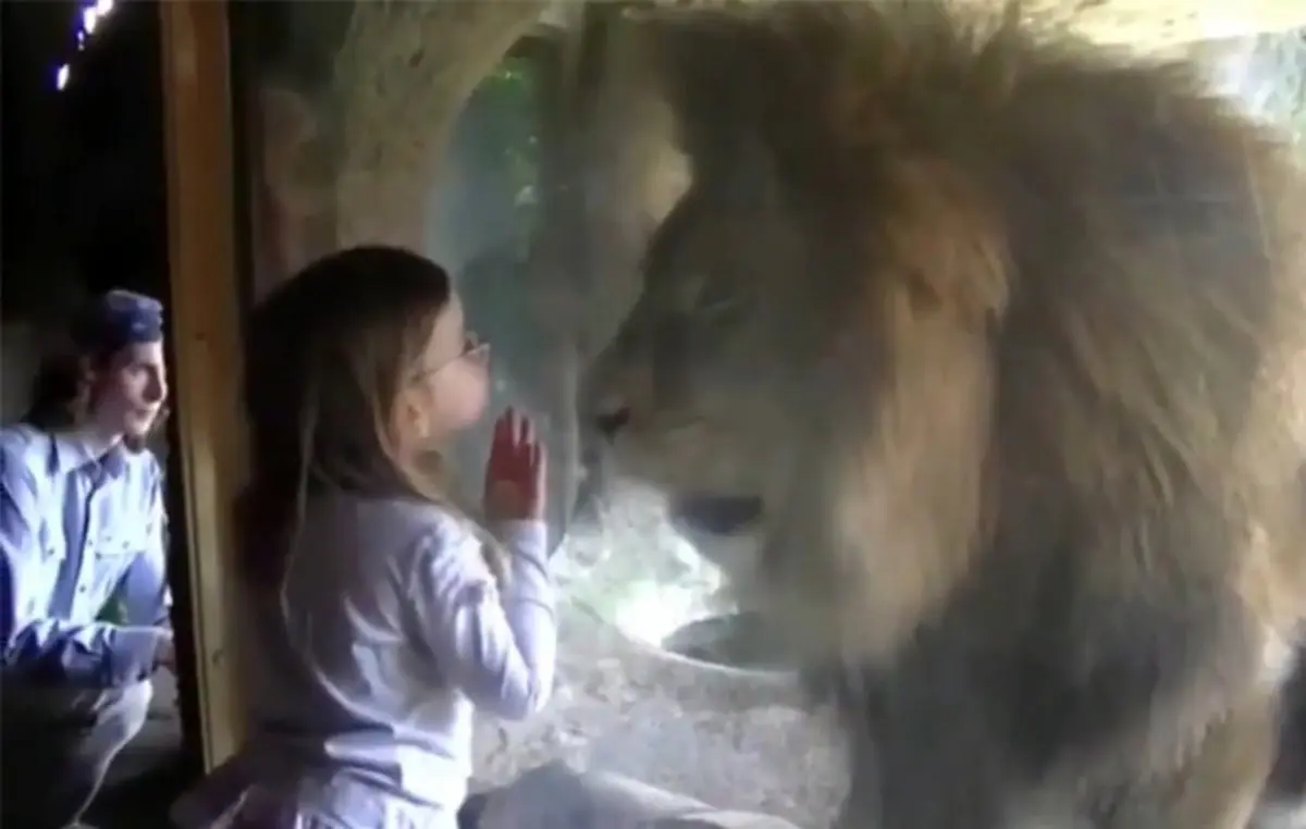 رکنا: دختر کوچک پس از بوسیدن شیر از پشت شیشه با واکنش عجیب این حیوان مواجه شد.
