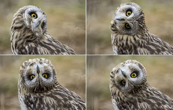 «آلن بالتازار» عکاس حیات وحش میگوید در حین عکاسی از جغد بودم که متوجه حضور من و دوربینم شد و پس از نگاه خیرهای طولانی ناگهان سرش را کاملاً به سمت پایین چرخاند به صورتی که چشمهای حیوان در قسمت پایین و منقارش در بالای سرش قرار گرفت.