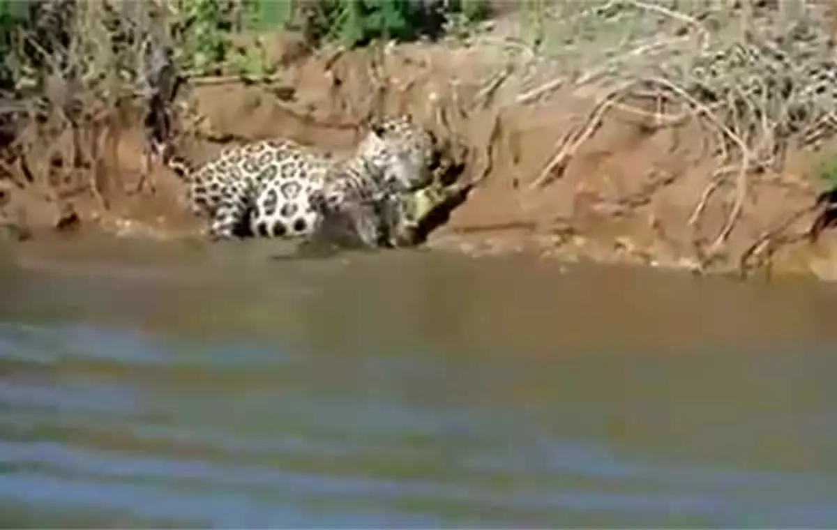 رکنا: یک توریست در جنگل آمازون برزیل وقتی در آنسوی رودخانه پلنگی را دید که حرکات عجیبی داشت تصور نمی کرد صحنه ای باورنکردنی را تماشا کند.
