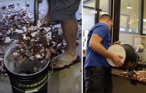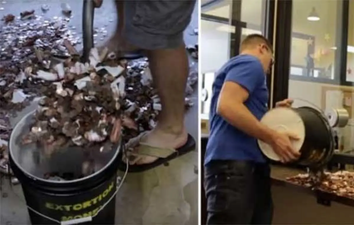 این مرد در یک ویدئو مستند با کینه توزی 2 سطل را برداشته و روی یکی نوشت "پلیس پولکی" و روی دیگری "پول زور" و آن ها را با 22 هزار سکه یک پنی پر کرد و برای پرداخت جریمه اش با خود به مقر پلیس برد.