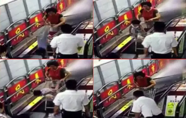 دختربچه چینی که داخل سبد خریدی در فروشگاهی واقع در استان شانشی ایستاده بود، به علت گیر کردن چرخ سبد در آخرین پله افقی پله برقی با سر بر زمین فرود آمد. فیلم تکان دهنده بی احتیاطی این مادر 7 اگوست توسط دوربیت های مدار بسته فروشگاه ثبت شده است. بر اساس گزارش رسانه های چینی، قربانی با جراحت جزئی تحت درمان قرار گرفت و در حال حاضر حال اش نیز مساعد اعلام شده است. کارشناسان ایمنی به خانواده ها درخصوص ایستادن کودکان در قسمت جلویی سبد خرید روی پله برقی هشدار داده است. اخیرا تدابیر امنیتی چین بدنبال حادثه ای که برای یک مادر و پسر 2 ساله اش در سال گذشته رخ داد، افزایش یافته است. در این اتفاق مادر چینی زمانی که همراه فرزندش از پله برقی یک فروشگاه بالا می آید بر اثر باز شدن یک بریدگی در پاگرد پله ها داخل حفره می افتد و فقط می تواند فرزندش را از این گودال خارج کند. در این اتفاق دلخراش مادر فداکار بعد از نجات دادن جان فرزندش نتوانست جان خود را نجات دهد و به زیر چرخ های پله برقی رفت. فیلم دردناک فداکاری و ایثار این مادر چینی بارها در رسانه های جهان منتشر شد.