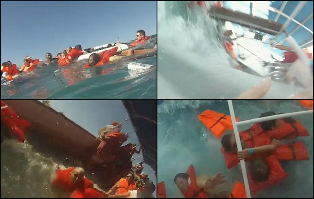 این حادثه در حالی رخ داده است که قایق تفریحی از یک طرف در آب فرو می رود و سرنشینان قایق دقایقی بعد در حالی که جلیقه نجات بر تن دارند روی آب شناور هستند.