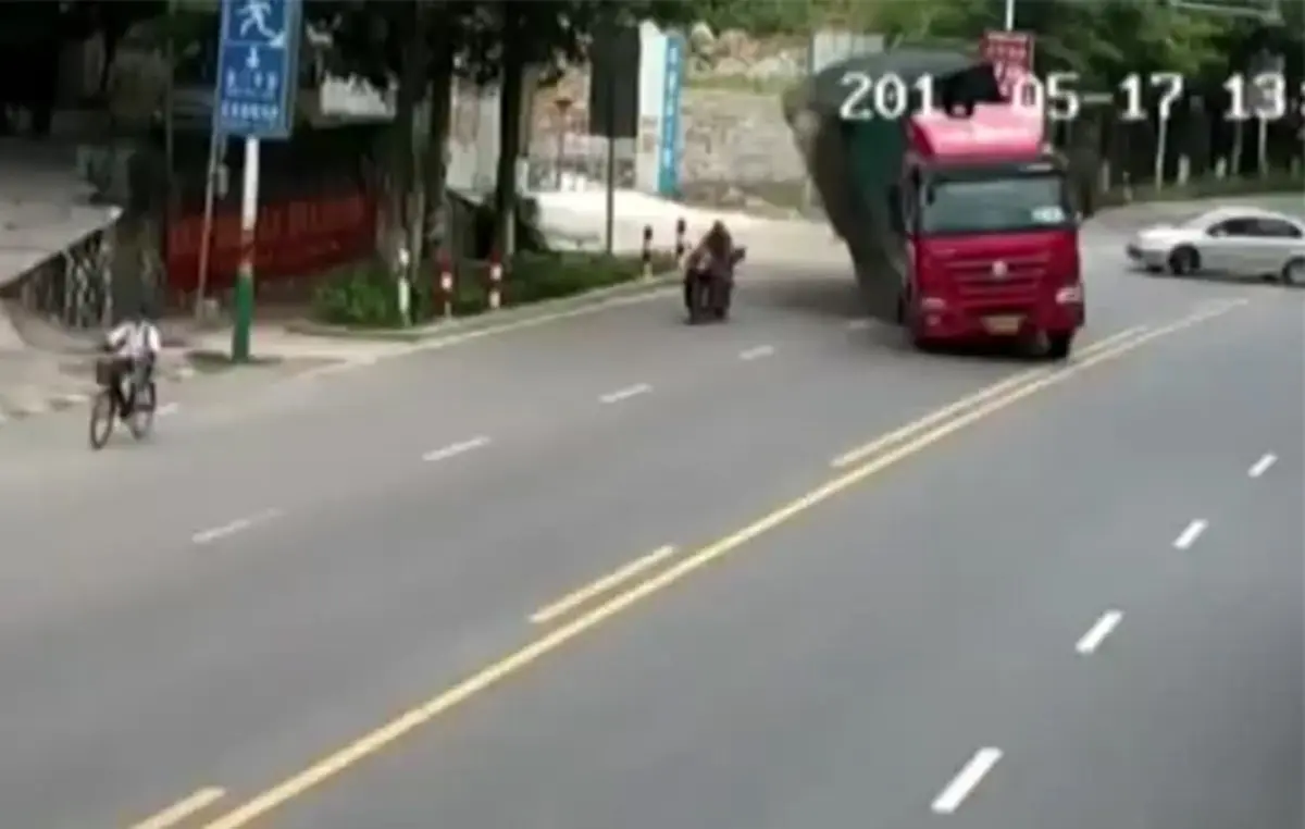 یک موتور سوار چینی در حالی که از خیابان در حال عبور بود ، بد شانسی آورد و بر یک کامیون حامل شن پس از وژگون شدن ، به سمت او ریخت ولی به نحوه شگفت آوری زنده ماند.