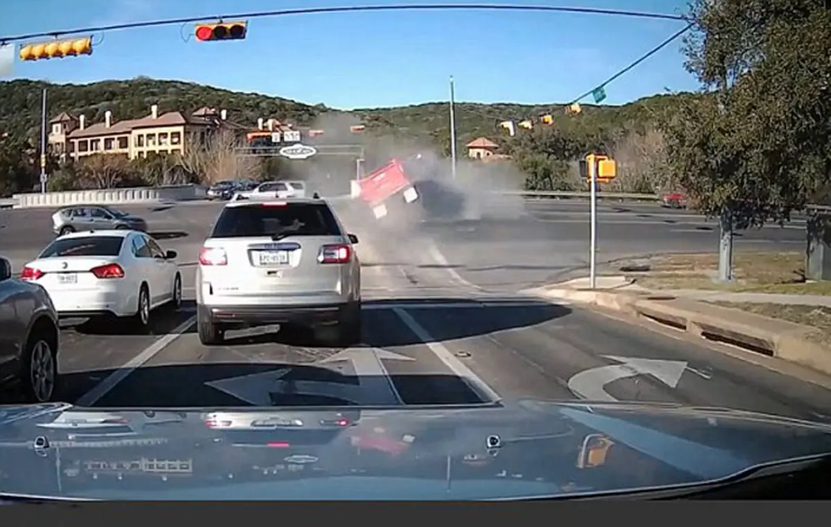 کامیون حمل زباله ماشین های پشت چراغ قرمز را جارو کرد + فیلم و عکس