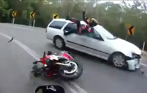 فیلم این تصادف که توسط دوربین روی موتور دیگری صبط شده است برخورد سنگین یک موتور سوار را با خودرویی در گردنه یک جاده و هنگام پیچیدن نشان می دهد. موتور این نجات یافته پس از برخورد آسیب های جدی دید.
