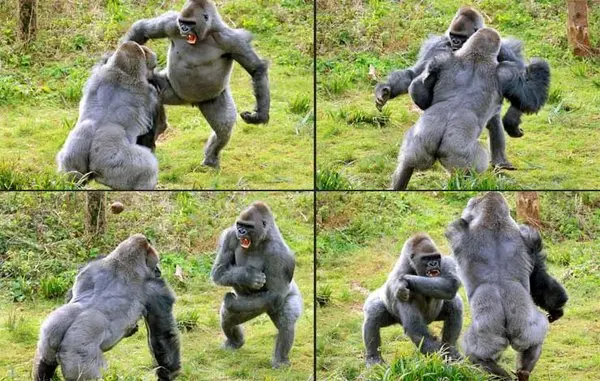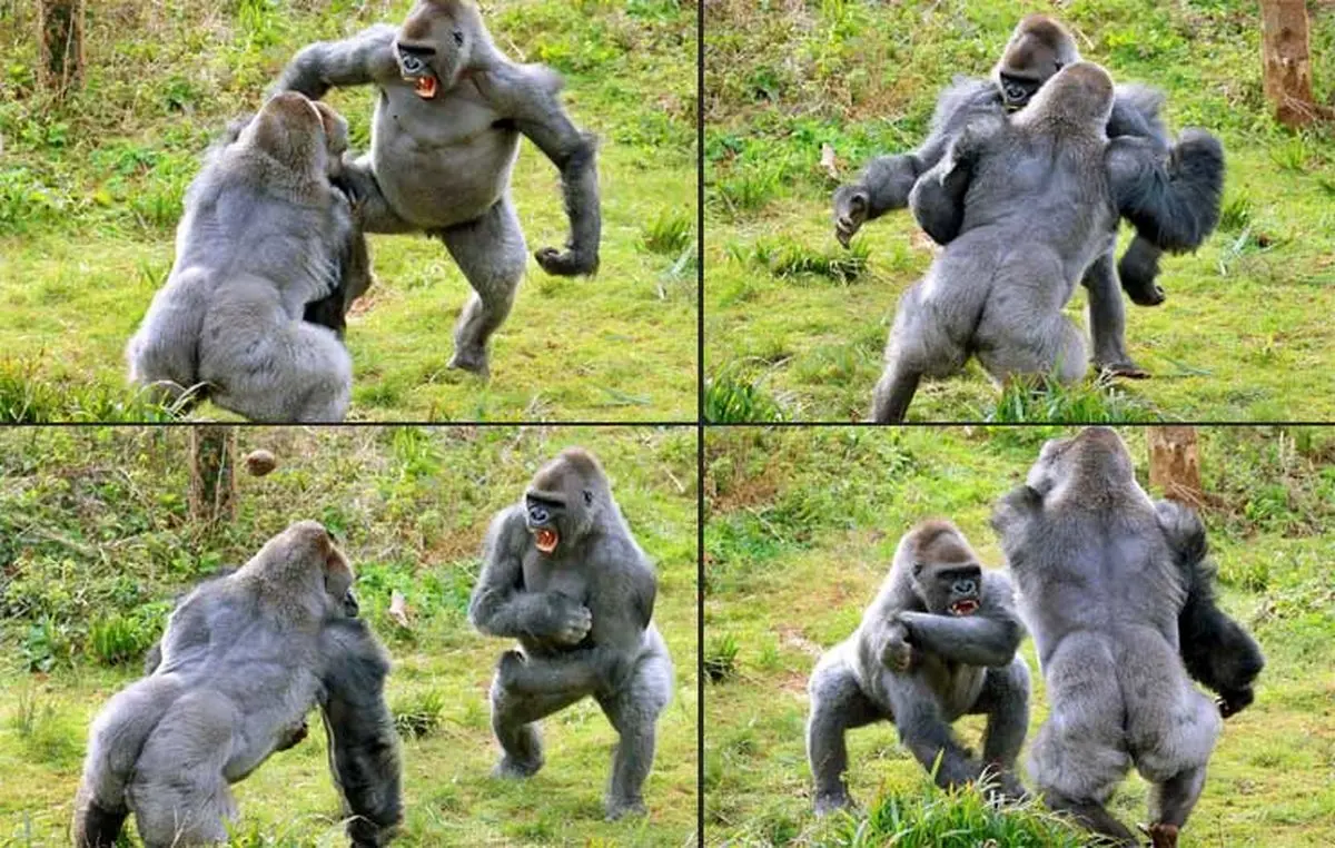 وزن هر گوریل بالغ بر 172 تا 186 کیلوگرم میرسد. آنها با نشان دادن دندانهای خود به یکدیگر و داد و فریاد و مشتهای گره کرده به جان یکدیگر افتادهاند.