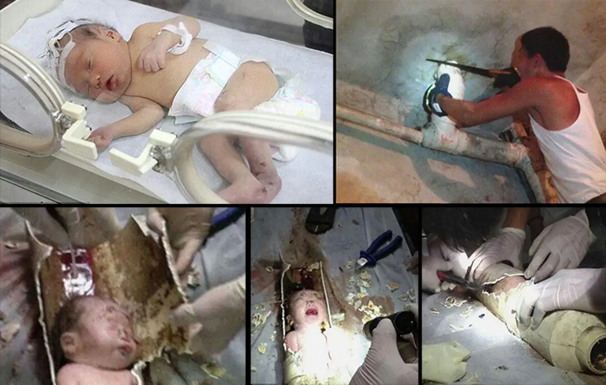 نیروهای امداد با رسیدن به این ساختمان در شهر جینهوا، در شرق چین متوجه شدند که واقعاً یک نوزاد در لوله فاضلاب است که با رسیدن به یک زانویی در لوله فاضلاب گیر کرده است و برای نجات این بچه امدادگران این بخش از لوله را جدا کردند تا هر چه سریعتر بچه را بیمارستان برسانند.