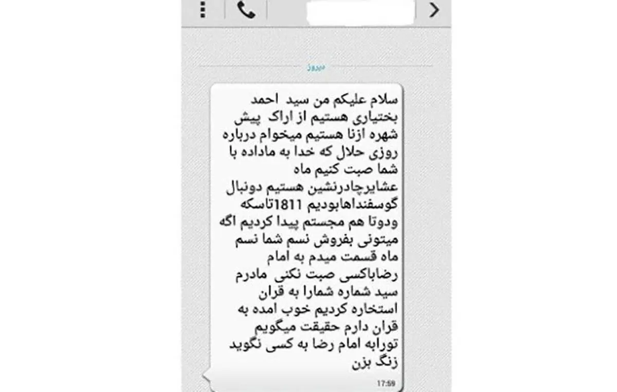 " سلام علیکم من سید احمد بختیاری هستم از اراک پیش شهره ازنا هستیم. میخوام درباره روزی حلال که خدا به ما داده با شما صحبت کنیم ماه عشایر چادرنشین هستیم دونبال گوسفنداها بودیم 1811 تا سکه و دو تا هم مجستم پیدا کردیم اگه میتونی بفروش نسم شما نسم ماه. قسمت یمدم به اما رضا با کسی صحبت نکنی مادرم سید شماره شما را به قران استخاره کردیم. خوب امد به قران دارم حقیقت میگویم."