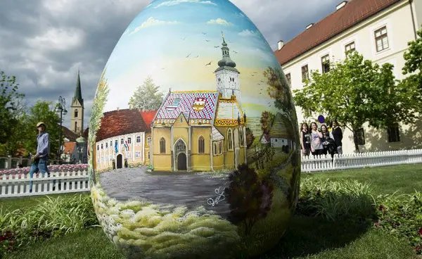 این تخممرغهای رنگ شده و غولپیکر در نزدیکی کلیسای جامع کاپتون در زاگراب کرواسی قرار داده شده تا مردم به تماشای آن بایستند.