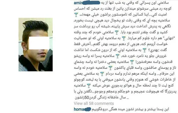 این پسر در لابه لای نوشته هایش آورده: سلامتی پسرهایی که وقتی شب تنها از کوچه رد میشی سرشونو میندازن پایین که احساس امنیت کنی!