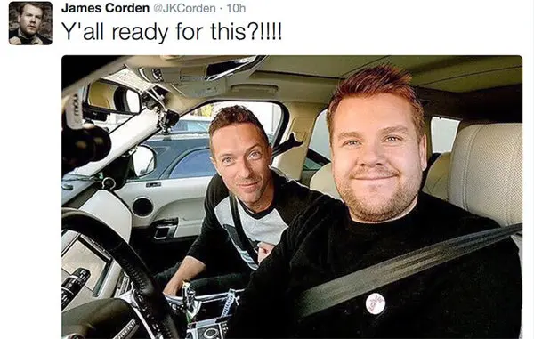 "جیمز کوردن" بازیگر، نویسنده وکمدین انگلیسی، برای ماجراجویی قسمت بعدی از همسفری کارائوکه "کریس مارتین" را دعوت کرده است. این کمدین با طرفداران برنامه " The Late Late Show" شوخی کرده و عکسی از خودش و یکی از اعضای گروه " کلدپلی" با کاربران به اشتراک گذاشته و زیر آن پرسیده: " همه برای این آماده هستیم؟"