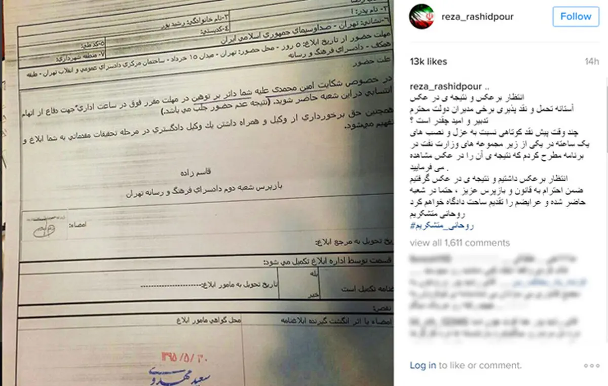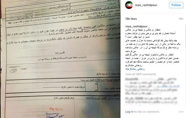 رضا رشیدپور با انتشار تصویر احضاریه خود در اینستاگرام نوشت:
