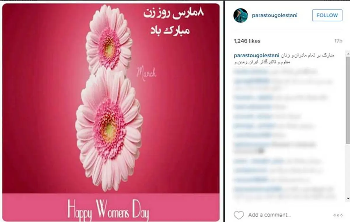 رکنا: امروز به مناسبت 8 مارس، روز جهانی زن، پرستو گلستانی با به اشتراک گذتشتن این عکس این روز را اینگونه تبریک گفت: